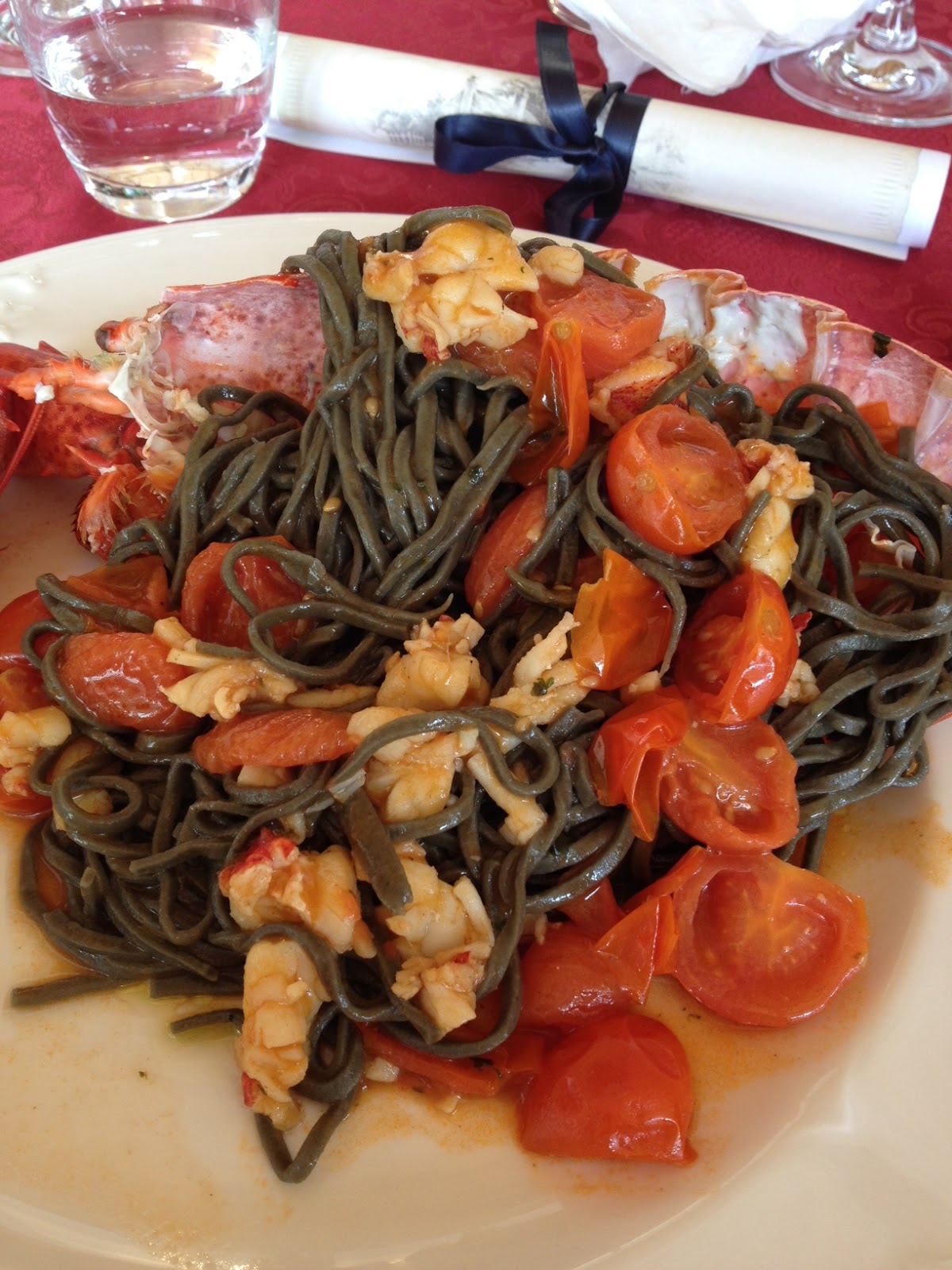 | Tagliolini freschi al nero di seppia con astice e pomodorini confit |